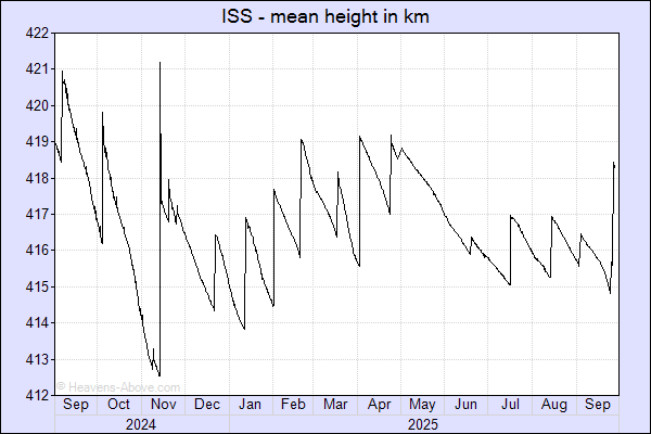 | This plot shows the orbital height of the ISS over the last year. Clearly visible are the re-boosts which suddenly increase the height, and the gradual decay in between. The height is averaged over one orbit, and the gradual decrease is caused by atmospheric drag. As can be seen from the plot, the rate of descent is not constant and this variation is caused by changes in the density of the tenuous outer atmosphere due mainly to solar activity. (Source) |